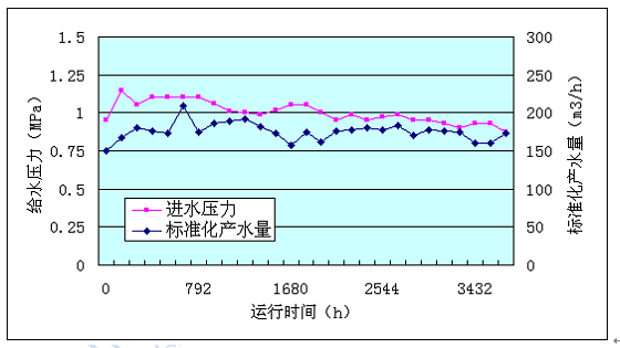 反滲透系統(tǒng)投運6個月內沒有經過任何化學清洗,由于原水含鹽量、溫度變化,系統(tǒng)的操作壓力和產水量也隨之變化。為了能夠準確的把握反滲透系統(tǒng)的運行 狀況,我們對實際運行數(shù)據(jù)進行標準化分析,經過標準化后的系統(tǒng)運行數(shù)據(jù),可以消除系統(tǒng)運行溫度以及操作壓力對產水量和產水水質對的影響,能夠真實反應反滲透系統(tǒng)的運行狀況。