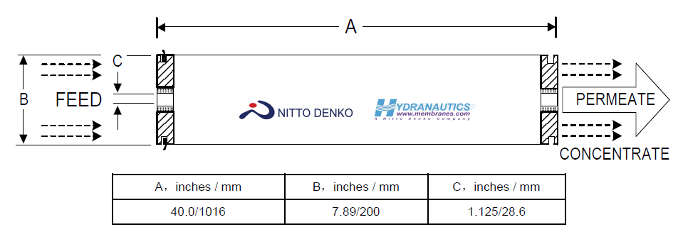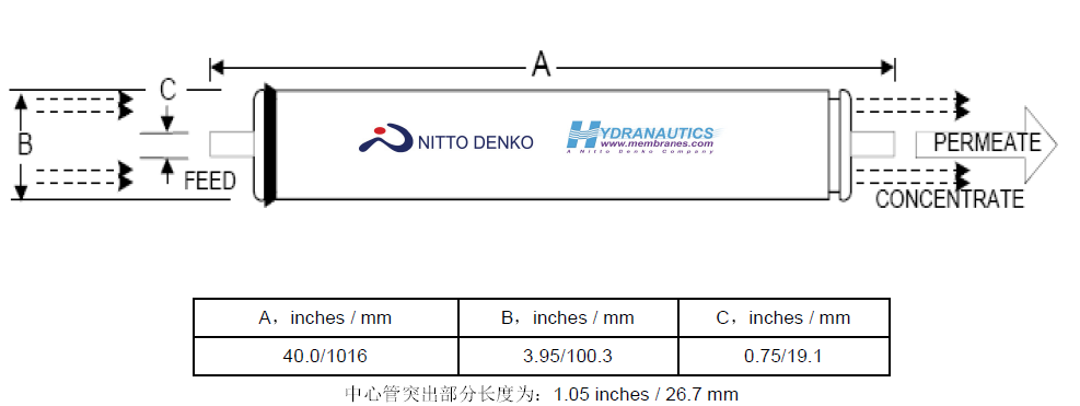 注意:產水量的偏差范圍一般在±15 %之內,有效膜面積的偏差范圍在±4%之內。每一支膜元件在出廠時均包含一個濃水密封圈、一個連接適配器以及相應的O型圈。全部膜元件均真空密封在聚乙烯 塑料袋中并添加不大于1.0 %濃度的亞硫酸氫鈉作為保護液。真空保護的膜元件最終貯存于紙箱中。